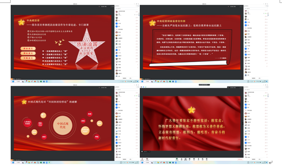 11月21日,支部党员宋慧给同学们带来了一堂线上党课。首先,她带领支部党员们回顾了二十大报告内容,解读并强调了“新时代十年的伟大变革是全方位、根本性、格局性的”、“报告首次单独把法治建设作为专章论述、专门部署”、“全面从严治党永远在路上、党的自我革命永远在路上”三个要点;她讲道,“党的二十大报告中提出要推进高水平对外开放,稳步扩大规则、规制、管理、标准等制度型开放,提出要加快建设贸易强国,提出要‘维护多元稳定的国际经济格局和经贸关系’。这样的对外开放格局设计体现的是中国与世界合作共赢的理念,体现的是“两个共同体”彼此联通、同向共进的主张。最后,她以二十大报告中有关青年的论述结束了这堂党课。