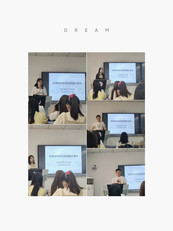 5月15日下午2:30到4:20分,国贸系党支部邀请大四优秀本科毕业生张琳、郭梦婷、佘飞妮、王拯和孙宇航为学院2022级大一学生举办经验分享会。分享会由国贸系党支部书记张美云老师主持,学院2022级40多学生参与了分享会。