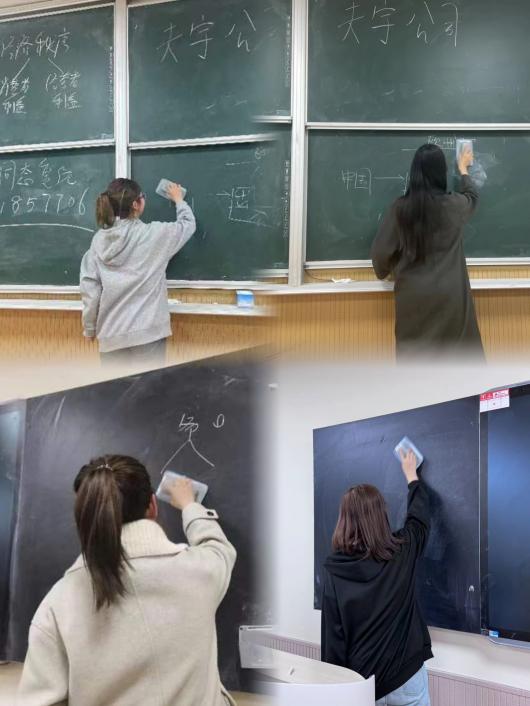 为了强化示范引领作用,打造“服务型”党支部。司机社 学生第二党支部同时开展教学楼黑板、桌面“清整”活动。预备党员们身体力行,将课后黑板上留存的字迹擦干净、智能教学一体机桌面整理好,尽自己的努力创造干净整洁的教学环境。