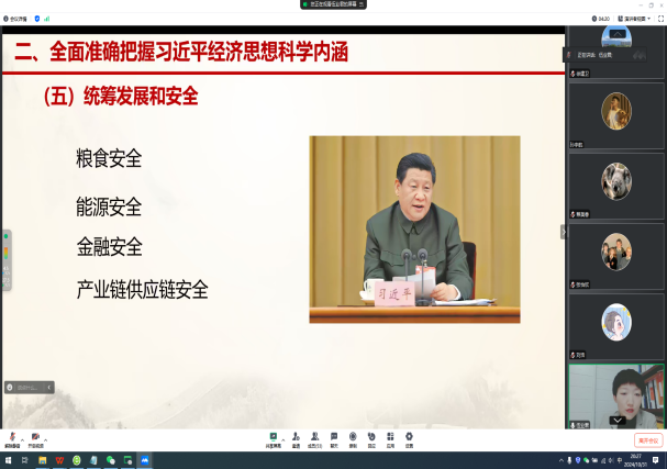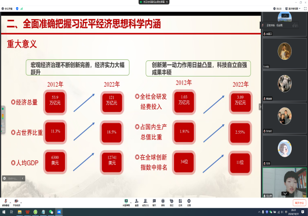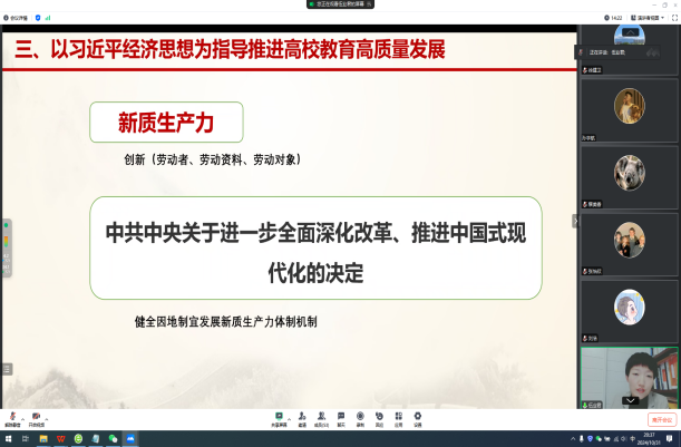 2024年10月31日晚7时,铁道党校领导科学和现代科技教研部副教授武业君博士受邀,为司机社 党员教师及学生作题为《深刻理解习近平经济思想的形成与发展》的专题讲座。本次讲座在线上举行,司机社 陈小勇副院长、司机社 各支部书记及党员师生共50余人参加,讲座由金融支部书记徐建卫主持。