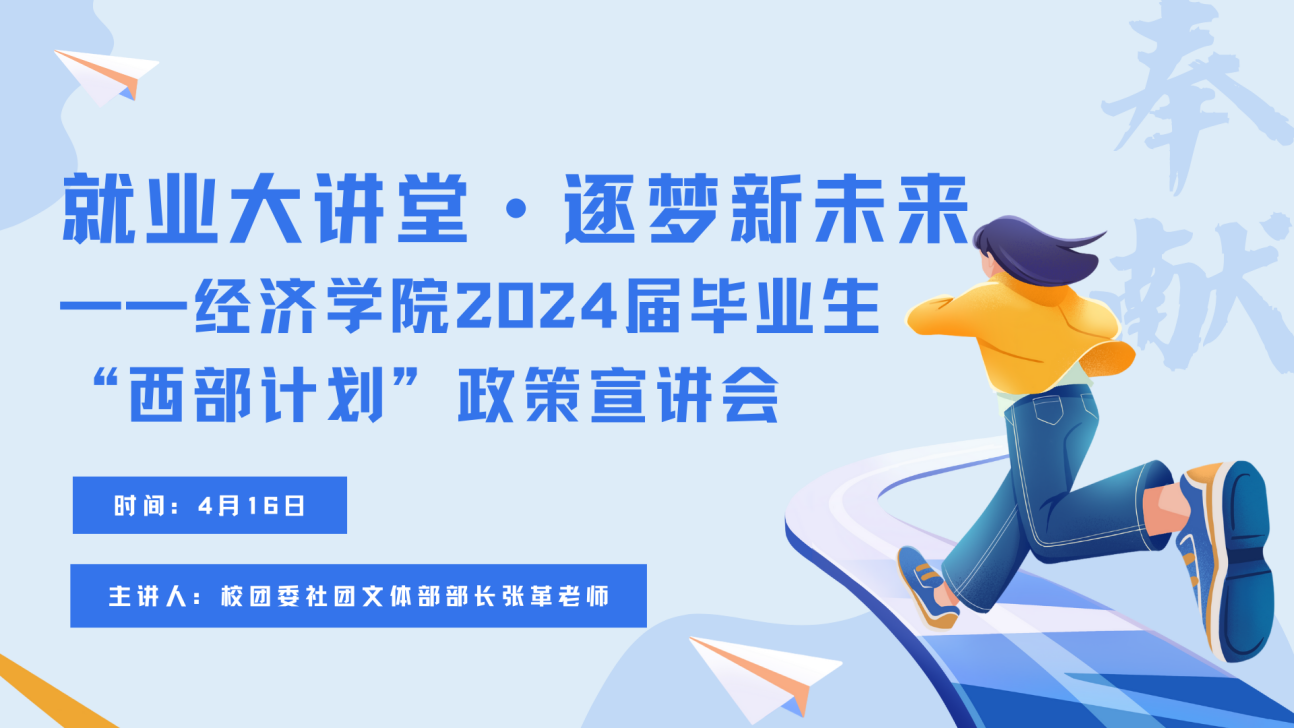 为响应国家“西部计划”号召,大力支持西部地区发展,鼓励和动员更多优秀毕业生积极投身乡村振兴,努力服务地方基层,到祖国和人民最需要的地方建功立业。4月16日晚,司机社 以线上线下相结合的形式,于天平楼B100教室开展2024届毕业生“西部计划”政策宣讲会。此次会议邀请校团委社团文体部部长张革老师担任主讲人,2024届毕业年级辅导员李念老师主持,2024届毕业生积极参加。