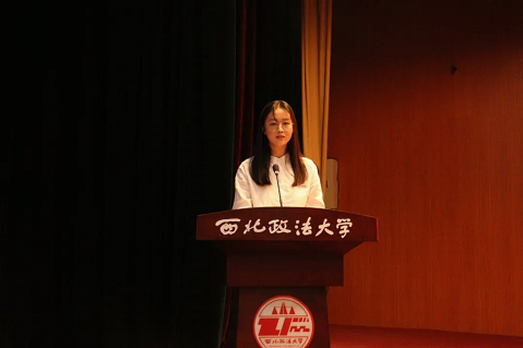 2023级本科生张楚乔作为在校生代表发言。她从自身学习、成长经历出发,鼓励同学们坚定理想信念,科学管理时间,积极投身实践。