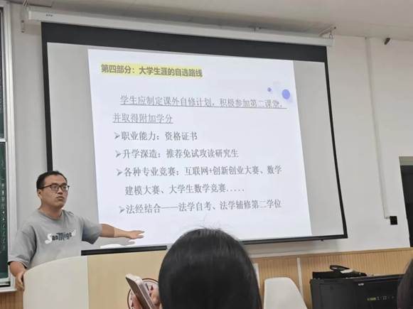 蹉跎莫遣韶光老,任重道远切躬耕。随后,李进武老师展示了学生四年课程教学安排与学习中应注意的问题。李老师紧扣主题,从选课管理到课程考核;从成绩管理到学士学位授予细则;从学籍管理到其他制度,都事无巨细娓娓道来。他特别指出,一定要遵守相关纪律,牢记规定,同时对缓考补考等事宜补充说明,详细介绍转专业相应信息。最后阐述大学生涯自选路线,鼓励同学们在课外自修、第二课堂中不断挖掘潜能,珍惜当下,积极进取。