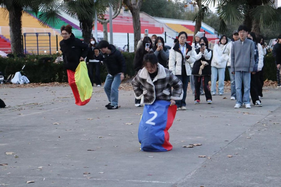 活动第二项是“袋鼠跳”。25米的路程,同学们要以袋鼠跳方式到达终点,下一人接力跳回原点,直到所有人完成后结束。虽然过程有些艰难,但同学们坚持不懈地前行,每一次抵达接力都是团队精神的象征。