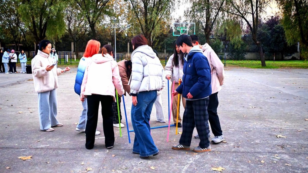 活动第四项是“不倒森林”。8人一组围成圆,左手放到背后,右手掌心压住棒子顶部使其竖立,游戏中成员要稳住前一个人的棒子顺时针移动一步,棒不能倒。这项任务让同学们深刻意识到团队协作的重要性,也通过这个游戏拉进彼此距离。