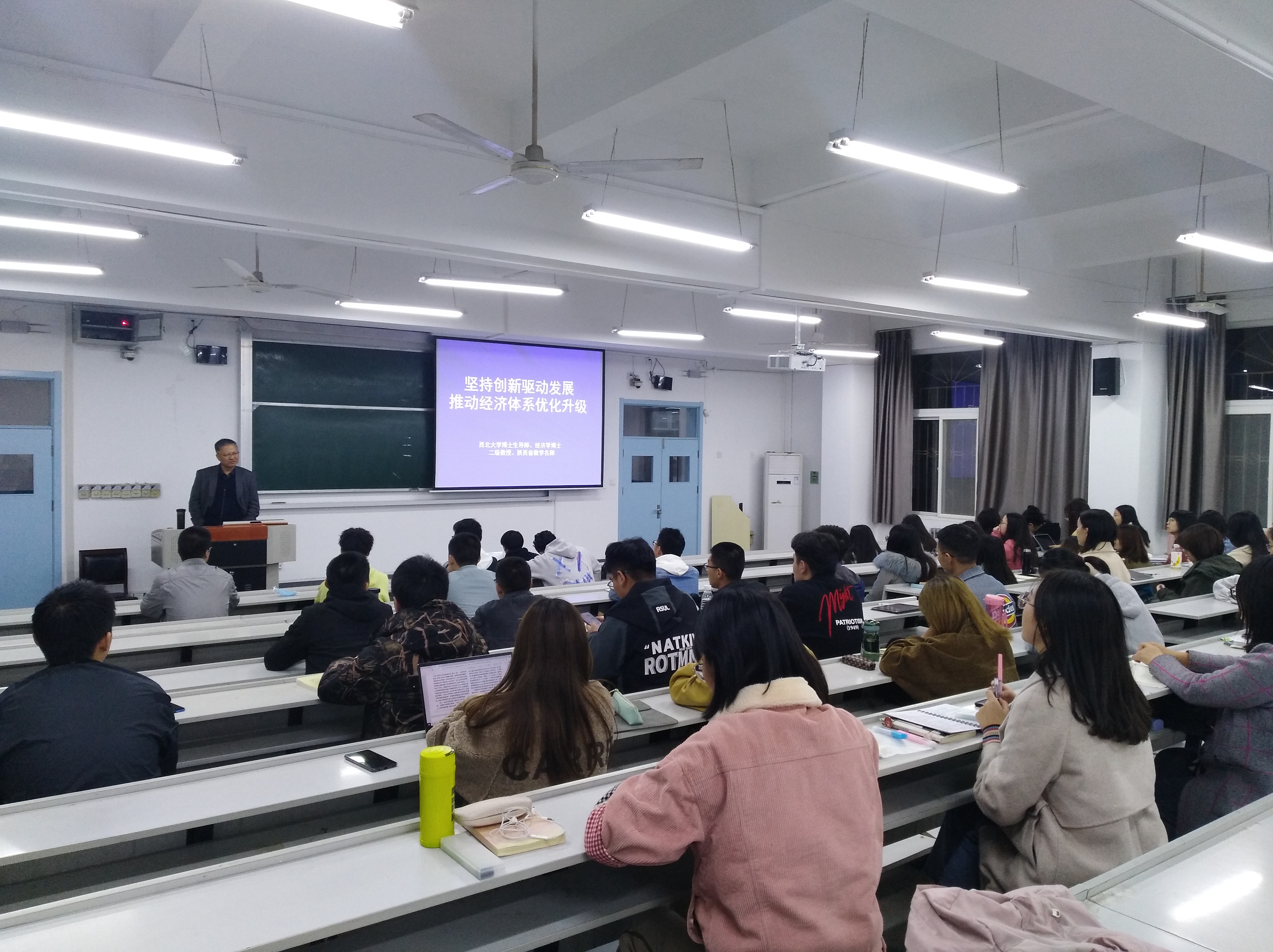 11月9日晚,西北大学博士生导师惠宁教授应邀来司机社 作了题为“坚持创新驱动发展,推动经济体系优化升级”的学术讲座,学院全体研究生参加报告会,报告由学院副院长王胜利教授主持。