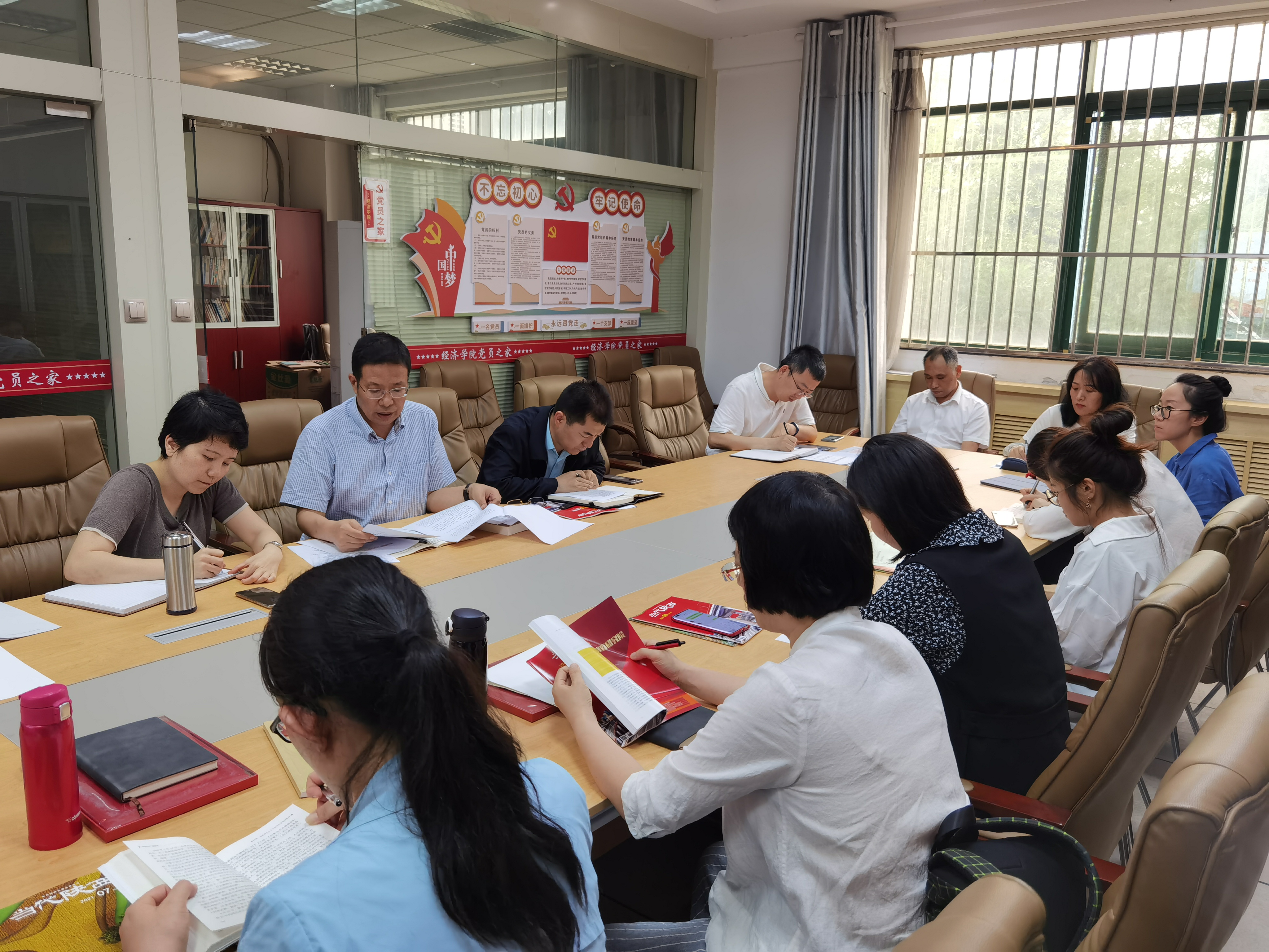 组织员段蓓蕾领学了《论中国共产党历史》中“继续从延安精神中汲取力量”、“习近平总书记在庆祝中国共产党成立九十五周年大会上的讲话精神”两篇文章;基础部党支部书记齐琼讲读了《中国共产党简史》第四、六章“夺取新民主主义革命的伟大胜利”“探索中国自己的社会主义道路”;研究生党支部书记宋玉茹领学了《习近平新时代中国特色社会主义思想学习问答》中有关坚持和发展中国特色社会主义的内容。