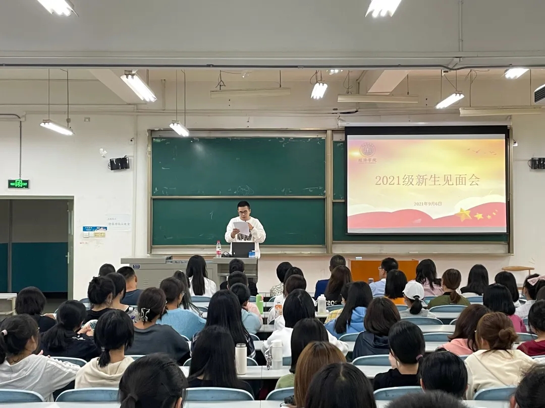 最后,院长王胜利为全院新生讲述“司机社 开学第一课”。他首先介绍了学院发展历程,学科专业、师资状况。他指出,我国进入新发展阶段,贯彻新发展理念,构建新发展格局对于大学生提出的新的使命,大家要准确把握时代脉搏,紧跟时代发展步伐,将所学经济学理论与经济社会发展实践紧密结合,潜心钻研学术科研,积极为建设社会主义现代化强国做贡献。最后,王胜利从“弘德”和“启智”两个方面具体讲述,如何立足经济类专业勇担使命,成为适应新时代的应用性人才,并提出了树立远大目标,明确人生目标,加强思想道德建设,培养经济学思维,牢记诚信为本等建议。