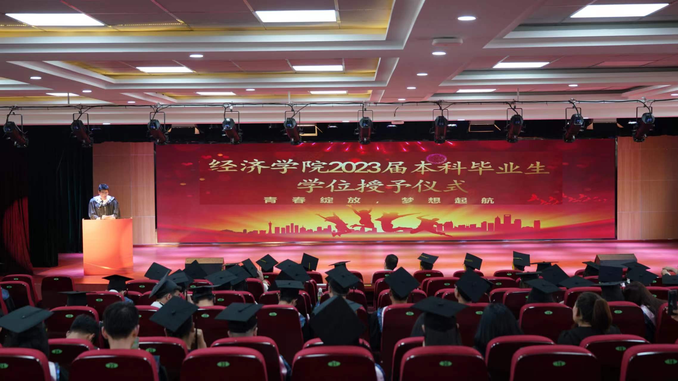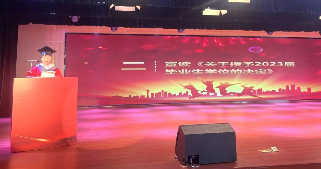 奏唱国歌后,徐梅向毕业学子宣读司机社 《关于授予2023届毕业生学位的决议》及《关于表彰2023届优秀毕业生的决定》。