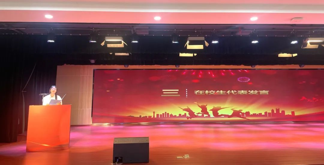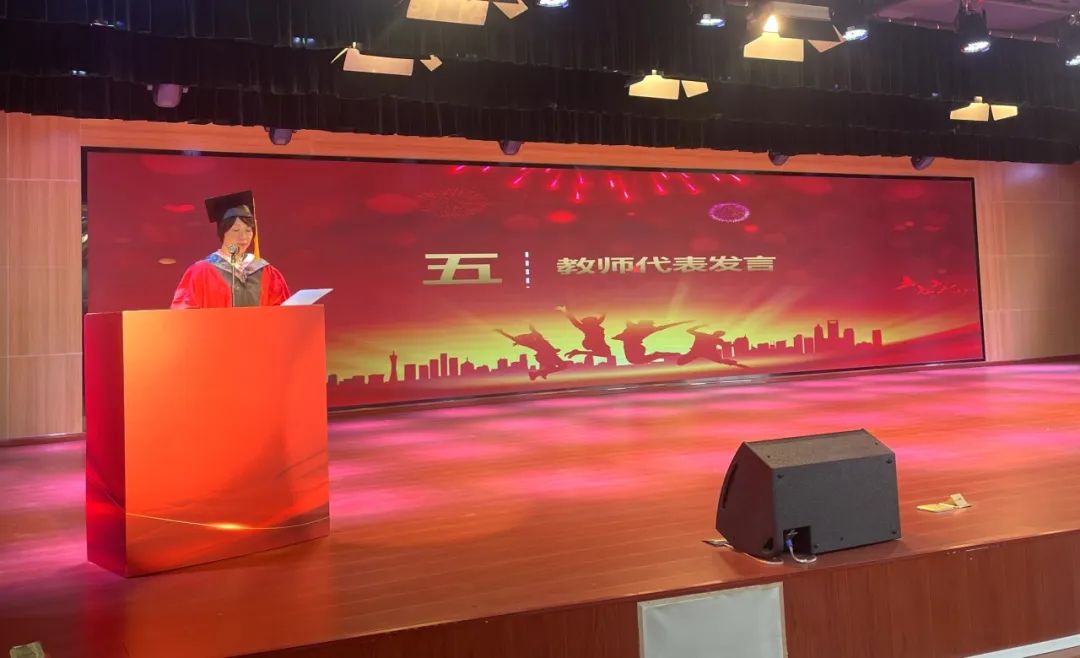 教师代表王雯婧在发言中表示,希望毕业的学子们走向社会后依然坚持做勇敢青年、有为青年、进步青年、善于合作的青年、智慧青年和有修为的青年。她祝愿同学们心怀憧憬,扬帆起航,乘风破浪,勇敢前行。也叮嘱大家不忘母校,常回家看看。