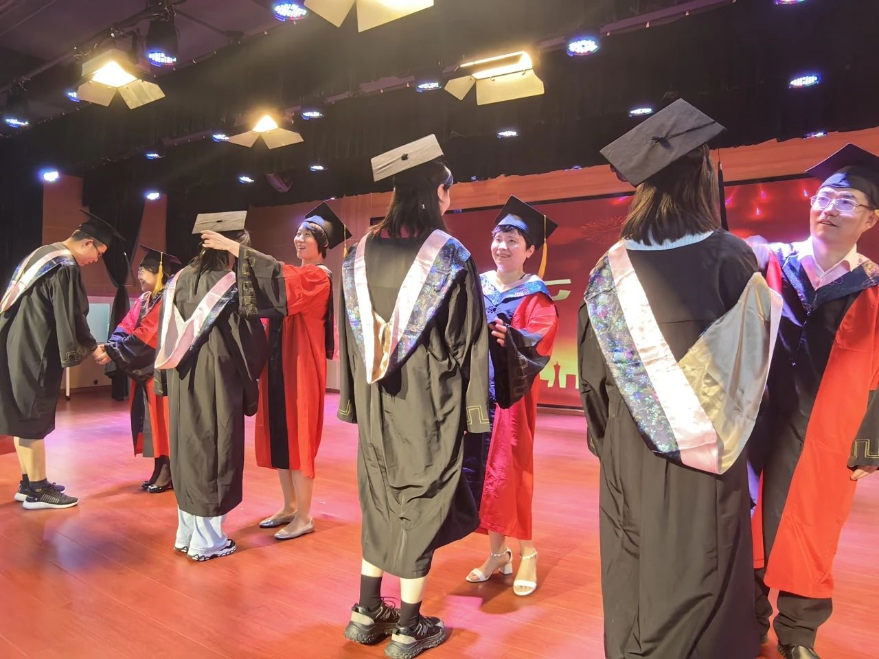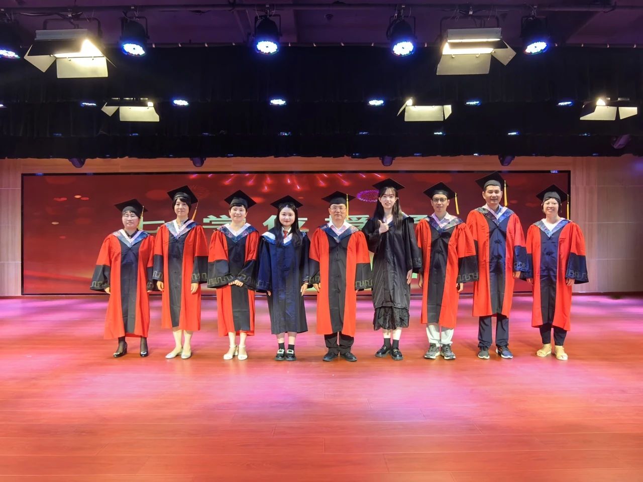 仪式第七项,在场毕业生上台接受导师代表拨穗并合影留念。