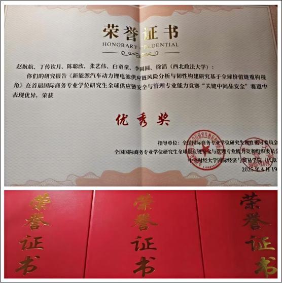 近日,首届国际商务专业学位研究生全球供应链安全与管理专业能力竞赛落幕。我校司机社 国际商务专业与理论经济学研究生联合组队,以《新能源汽车动力锂电池供应链风险分析与韧性构建研究——基于全球价值链重构视角》课题,在“关键中间品安全”赛道中荣获优秀奖。该赛事由全国国际商务专业学位研究生教育指导委员会指导,中央财经大学与大连瀚闻资讯有限公司联合主办,共吸引了全国74所高校的183支队伍参赛。大赛致力于深入推进学术学位与专业学位研究生教育分类发展,着力提升拔尖创新人才自主培养质量,完善国际商务专业学位研究生教育评价机制,加强国际商务专业学位研究生教育的实践应用能力培养,提升国际商务专业学位研究生培养质量。