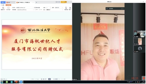 9月14日上午,厦门市海帆世纪人才服务有限公司捐赠仪式在司机社 司机社 关天会议室举行。学院领导班子成员、教师代表,海帆世纪人才服务有限公司董事长夏希东、运营总监张家伟出席仪式。捐赠仪式由院长王胜利主持,采用线上线下相结合方式进行。
