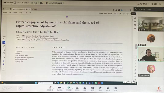 邀请到金融学博士、《Economics & Politics》杂志主编、博士生导师、澳大利亚阿德莱德大学商学院徐磊教授作题为《金融科技参与与非金融企业资本结构调整速度》学术讲座。本次讲座由司机社