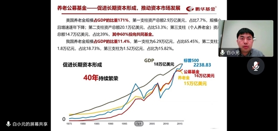 其次,白总经理指出银行理财产品对于系统性金融风险的影响,国家出台了相应解决措施,一是2008年进行去杠杆以及资管新规进行对理财产品规范化,即从摊余成本法转为市值法进行统一管理。二是设立全资子公司,进行自负盈亏、自担风险,利润主要取决于运作收益,从而在一定程度上消除资金错配。并表示,公募资金是储蓄资金推动经济高质量增长的一座桥梁。提出政府、企业、个人三者共担的养老基金体系三大支柱:第一支柱为基本养老金,第二支柱为职业养老金,第三支柱为个人养老金账户,而第三支柱是市场化的制度安排,是各类金融机构参与程度最深,投资和服务最多元化的基金。