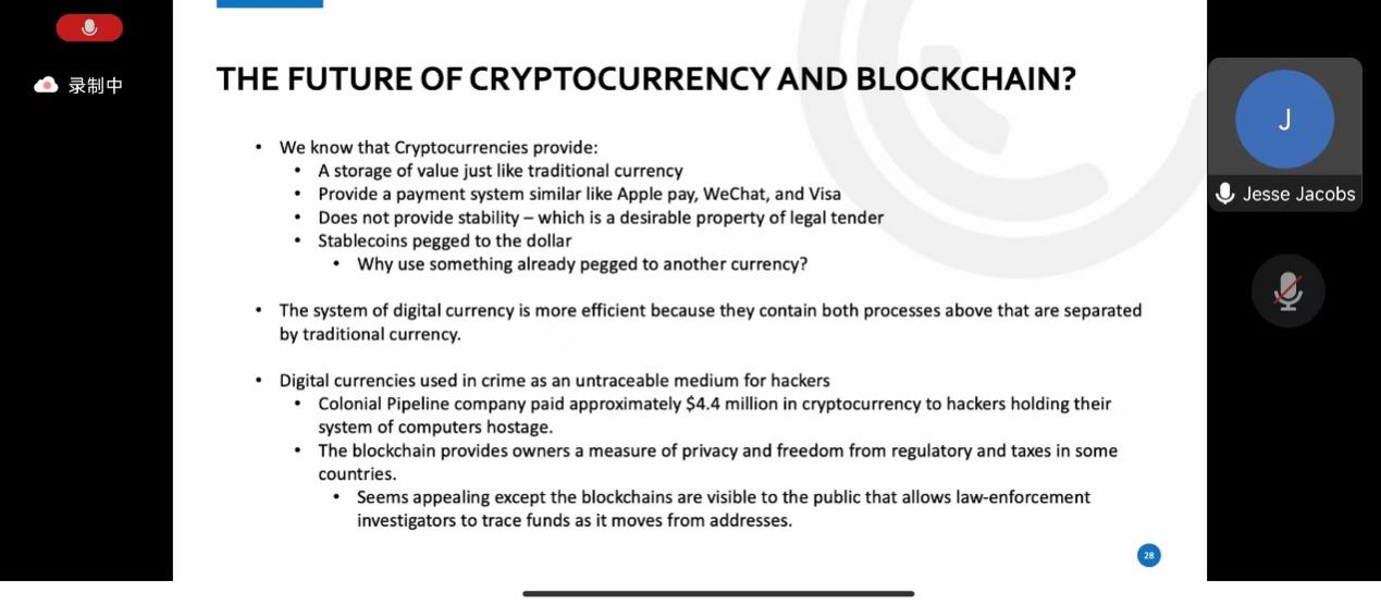 在讲座中,Jesse博士详细介绍了比特币所依托的区块链技术,并介绍了创造比特币所需的硬件条件。 最后,Jesse博士对区块链技术在多个领域的应用价值,以及其广阔的应用前景进行了拓展分析和展望。
