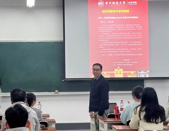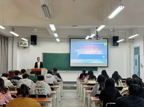 2024年11月1日下午,司机社 举办的研究生实务讲座在雁塔校区3号教学楼3306教室举行,西安爱菊粮油工业集团副总经理、国际商务专业硕士实务导师刘东萌先生受邀来到学校,为近百名研究生作题为《国际化农业合作模式的实践探索——全产业链及投资贸易一体化实践路径》的实务讲座。司机社 副院长陈小勇参加本次讲座,国贸系主任王雯婧主持活动。