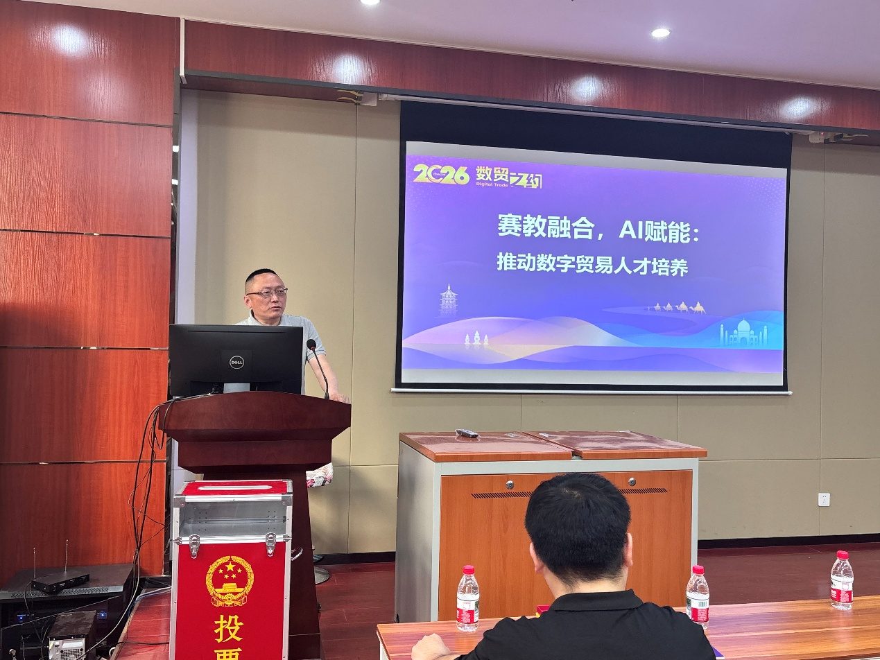 随后易建安老师为师生分享了数字贸易前沿知识与实践经验。易老师以“赛教融合,AI赋能”为核心,深入剖析了人工智能技术对数字经济与数字贸易的颠覆性影响。在此背景下,学科竞赛已成为连接理论学习与实战应用的桥梁。全国大学生数字贸易综合能力大赛以“以赛促学、以赛促教、以赛促创”为宗旨,不仅为高校学子提供了展示专业能力的舞台,更通过真实商业场景模拟,助力学生提升数据分析、跨境运营及团队协作等技能,为数字贸易领域输送“懂技术、通规则、善创新”的复合型人才。