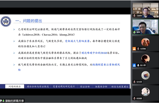 潘敏教授是武汉大学金融发展与政策研究中心主任,他此次讲座的主题是他们团队正在开展的一项研究。潘教授首先通过实例展示了极端气候发生与银行风险状况的变化具有显著的相关关系,在对现有研究文献进行系统述评的基础上,他深入分析了极端气候对银行风险造成影响的传导机制,以及在不同银行间可能存在的异质性,进一步明确了研究问题和研究目标。