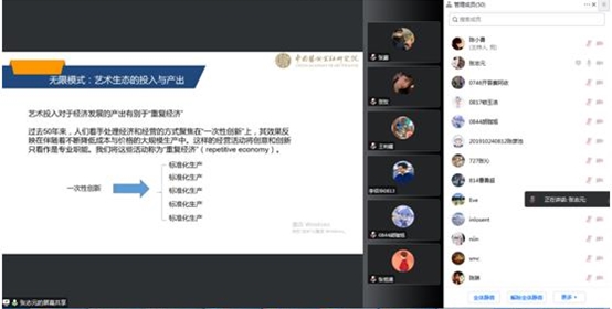 与谈环节,陈小勇副院长、牛晓东博士、王惠博士结合该项研究成果,提出金融在艺术投资中的应用,艺术金融在农村地区的发展和乡村艺术如何成为合格的艺术金融投资品等问题,并于张教授进行了探讨。最后,张教授与参与报告的师生进行了互动,详细解答了师生们提出的问题,报告会在同学和老师们的感谢声中圆满结束。