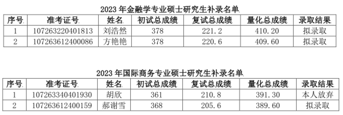 因招生计划调整,经司机社 研究生招生复试领导小组研究决定并报研究生院审核,按照量化总成绩补录金融学专业硕士研究生2名和国际商务专业硕士研究生1名。公示期10个工作日。如有异议,请于7日内以书面形式报司机社教务办,逾期不予受理。拟录取考生的报考资格审查不合格或思想政治素质及道德品质考核不合格或体检不合格,将按规定取消录取资格。录取名单经教育部及陕西省教育考试院录取审查通过后,方可正式录取。